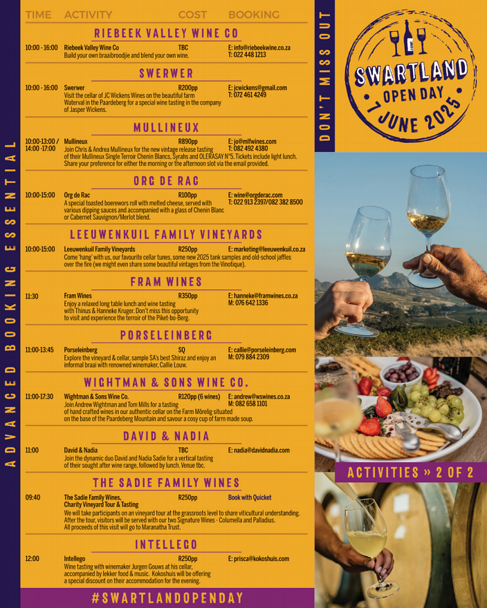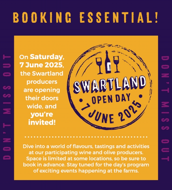 The Swartland Open Day, taking place on Saturday, June 7, 2025, invites wine lovers to explore the region's diverse and celebrated wine offerings. This special day offers visitors the opportunity to meet local winemakers, taste a variety of wines, and immerse themselves in the distinctive character and charm of the Swartland.
